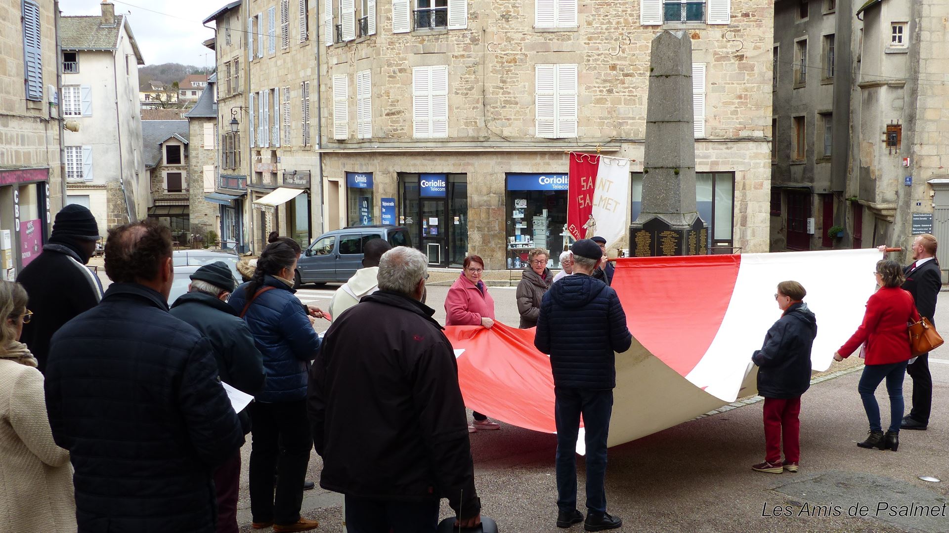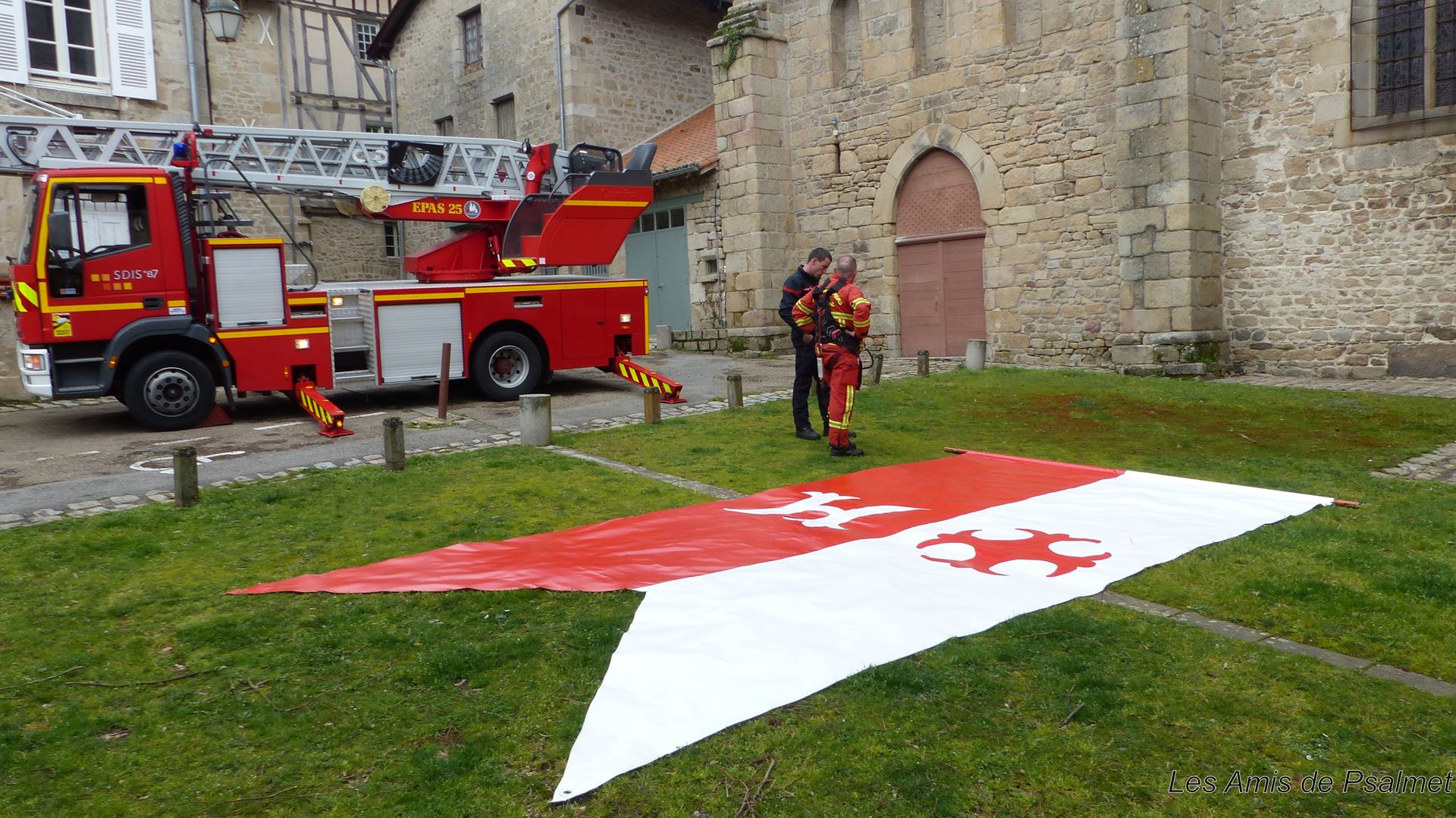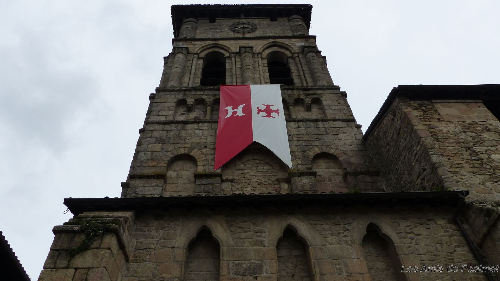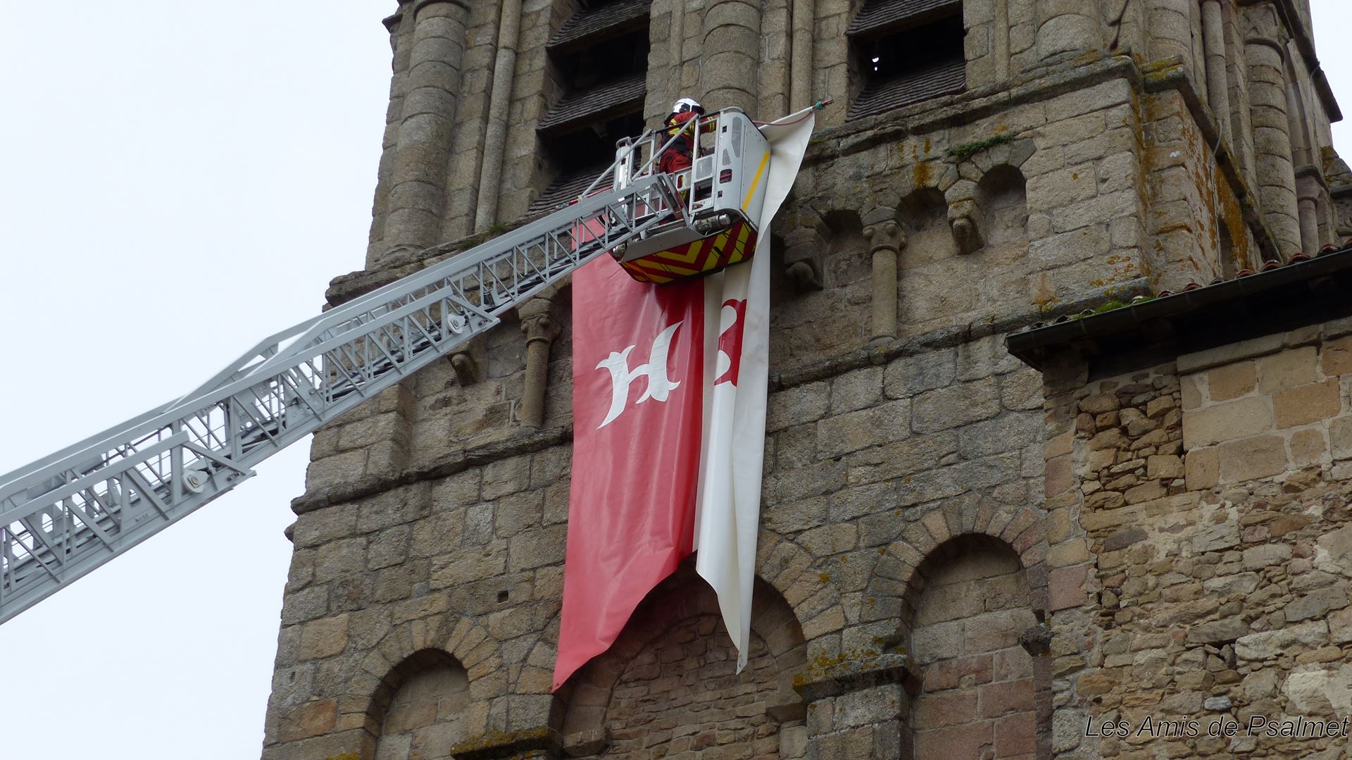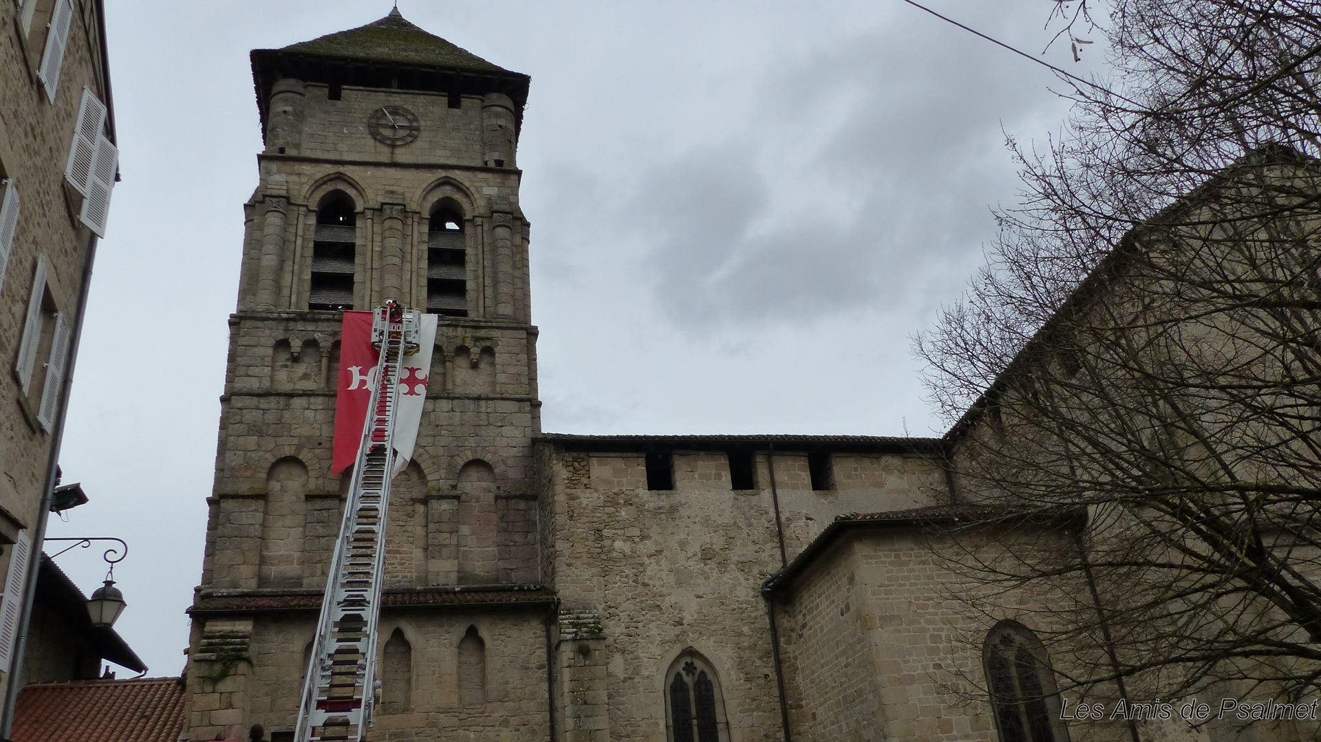 Le Samedi 25 mars 2023 à Eymoutiers, montée et bénédiction du drapeau ostensionnaire sur le clocher de la collégiale Saint-Etienne